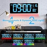 【Color Modern Night Light】The large LED digital wall clock has 4 monochromatic lights and 2 dynamic RGB lights to choose from, At the same time, there are 4 levels of brightness that can be adjusted by remote control, which can provide a wonderful atmosphere for your living room and bedroom. 【16.5" Large LED Digital Display】It has a 16-inch screen and four kinds of adjustable screen brightness. High-definition digital display screen with contrast allows you to read clearly from any angle and long distance. ATTENTION: Must be plugged in to work. Not battery operated. 【Multipurpose Digital Alarm Clock】 This large display timer clock has 3 modes: count up/down timer, alarm clock, Clock. You can just press mode button to change mode, easy to operate. User-friendly design, 12 or 24 Hour display formats with indoor temperature display in ℃ or ℉, meet your various needs. 【Wall-mounted and desktop 】The digital wall clock can be hung on the wall or placed on the desktop(with folding bracket). And there is a built-in memory function, even if the power is disconnected, the time data will not be lost. 【Convenient to Use】- The remote control for the extra large digital wall clock can be operated from up to 32 feet away, iving room, kitchen, garage, farmhouse, office, warehouse, classroom, gym, shop, nursery. And it is also the best gift for friends, partner and the elderly.