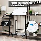 Versatile workstation: With options to sit or stand, and lock or roll, this whiteboard desk can accommodate your workday Lock in place: Easily lock the casters in place for secure positioning and unlock for easy mobility Height adjustable: You can work while sitting or standing thanks to the adjustable, two-tiered design for personalized comfort Durable and easy to assemble: Constructed of MDF and metal construction, this desk is sturdy and is easily assembled with the included instructions and necessary hardware Dimensions: This mobile desk measures 21 long x 21.5 wide x 43.75-68.5 inches tall (53.34 x 54.61 x 111.12-173.99 cm)