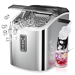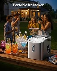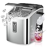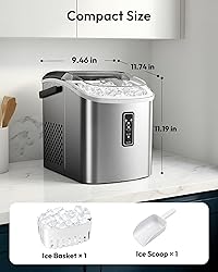 Efficient Ice-Making in 6 Minutes: Powered by a high-quality compressor, this countertop ice maker produces up to 9 ice cubes in just 6-12 minutes, with a daily capacity of approximately 26 pounds. It ensures that your daily ice needs are fully met. Operating at a noise level below 45dB, our portable ice maker guarantees a comfortable and quiet environment while you enjoy your ice. TWO SIZES OF Bullet-Shaped ICE CUBES: Create two different sizes of bullet-shaped ice cubes. Small ice cubes are perfect for chilling seafood and beer, keeping them fresh and cool. Large ice cubes are ideal for drinks, providing a quick cooling effect. Portable Design and Complete Accessories: With a sturdy handle and weighing only 13.9 pounds, this compact ice maker measures 9.46 (L) x 11.74 (W) x 11.19 (H) inches, making it easy to carry. It performs exceptionally well in various settings such as kitchens, homes, camping trips, RVs, parties, dorms, and more. The package includes a handle, ice basket, ice scoop, manual, and beautifully designed packaging. User-Friendly Control Panel: The control panel is simple and easy to operate. Just fill the small ice maker machine countertop with water, press the ON button, and select the size of the ice cubes. Indicator lights will alert you when water is insufficient or the ice basket is full. Easy Automatic Cleaning: The Euhomy countertop ice maker machine features a self-cleaning function. Simply add water and press the "On/Off" button for 5 seconds to activate this mode. This not only frees your hands but also ensures a clean ice maker.