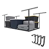 - This product includes a 3ft-by-6ft Overhead Storage Rack and a 4-Pack Add-On Storage Flat Hook Accessory. With a capacity of up to 450 lbs, it's very durable and heavy duty to use for years. Made of powder coated steel, the height of storage rack can be adjusted from 22 to 40 inches, providing a convenient and safe place to organize your stuff. This system is simple to set up and all the hardware and instructions needed are included in the package. It's a great option when you need to hang varios bicycles or other items for more floor room.