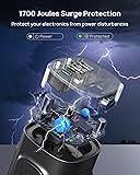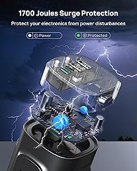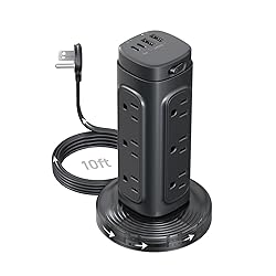 Semi-retractable Power Strip Tower: The black power strip surge protector features a 10ft flat power cord, allowing you to adjust the cable length as needed. Black blends perfectly with dark decor Note: Only 5ft of the power cable can be retracted and the rest 5ft will always left outside. Small Footprint Tower Power Strip with Switch: The vertical tower design takes up less valuable desk space but provides multiple plugs. The four-sided tower with widely-spaced outlets also allows you to use larger plugs without worrying about them blocking adjacent outlets 20W USB C Power Strip Tower: The USB power strip offers 12 widely-spaced AC sockets (1.5 in distance), 2 USB-A and 2 USB-C ports. Ideal for your home, office, college dorm room, or guest room. Note: The green USB C port offers PD 20W quick charging. Any 2/3/4 USB outputs shared 15W Flat Plug Power Tower: This flat plug power strip is built with an extremely slim plug (only 0.33” thick), which sits flush against the wall, and hides behind furniture easily. The 45-degree angled flat plug eliminates awkward cords from cluttering indoor décor and doesn’t block the bottom receptacle Power Strip with Surge Protection (1700 J): Made of the top-grade UL94 V-0 flame-retardant PC & ABS, the surge protector with USB ports provides reliable protection for your gaming console and other expensive devices. Protect your device from overload, short-circuit, and over-current