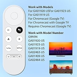 【Voice Search】Pressing the voice button on the remote, not only can you use voice search to find your favourite entertainment, but you can also use voice to control the volume, switch inputs, play music, and get answers on-screen 【EASY TO PAIR】Pair your new remote in just two steps: ①. Press the pairing button on your device; ②. Press and hold the Back and Home buttons simultaneously for 10 seconds until the LED on your new remote starts flashing 【Compatibility】Voice replacement for white Google-Chromecast-Remote, for Chromecast with Google TV Remote, for Google TV HD/4K Streaming Stick, for Google TV Streamer (4K). Only for Snow Chromecast Google 【Work with Models】TV Remote Control for Chromecast (Google TV), Chromecast with Google TV, Requires Chromecast (Google TV), GA01920-US, GA01923-US, GA01919-US 【Work with Model Number】Replacement Voice Remote for Google Chromecast 4k Snow/ HD TV for G9N9N, GA01920-US, GA01923-US, GA01919-US, GA02463-US, GA01409-US, GA02464-US 【Incompatible Devices】NOT Compatible with Google Chromecast lst Gen, NOT for Google Chromecast 2nd Gen, NOT for Google Chromecast 3rd Gen, NOT for Chromecast Ultra, NOT for Chromecast Audio 【BATTERIES COMPATIBLE】Insert 2 * AAA batteries. (Package not included batteries) 【FEATURES】32ft Range, 0.2s Response, 120K+ Clicks Tested. Features Anti-Slip Dot Design & Multi-Angle Control for Stable Operation. The replacement remote control of the Chromecast 4K Snow device has the same functions and performance as the original remote control, with comfortable grip and stable signal