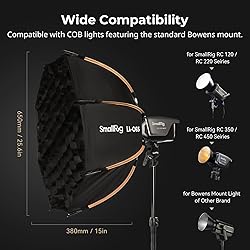 Wide Compatibility - The softbox is compatible with COB lights featuring the standard Bowens mount: in addition to supports SmallRig RC 120D / RC 120B / RC 220D / RC 220B / RC 350D / RC 350B / RC 450D / RC 450B, as well as extends its compatibility to other lights with Bowens mount, such as: for Aputure, for Godox, for Neewer. Quick Release Design - The Bowen mount softbox LA-O65 utilized a quick-release design, enabling effortless installation and disassembly with just a single click, thus simplifying the process and optimising the user experience. Premium Materials - This softbox features industrial-grade Oxford check soft double fabric and high-performance anti-reflective and anti-glare coatings to ensure an even, broad diffusion of light for improved photographic quality. Durable and Lightweight - Constructed with 8 high-strength stainless steel umbrella ribs, in addition, the net weight is only 725g, making it lightweight and easy to carry. Functional Accessories - This set includes 2 diffusion cloths and a 45° grid, allowing for enhanced softening effects and precise light control, catering to a variety of photographer needs. Additionally, it comes with a storage bag for easy organization and portability.