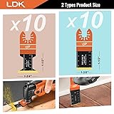 【2 Sizes 20pcs Titanium Multitool Blades】The 20-piece kit includes 2 different types of oscillating multitool blades, 10pcs 1-3/8 inches and 10pcs 1-3/4 inches 【Enhanced Durability】Compared with ordinary saw blades, the hardness of titanium saw blades is increased by 50%. Suitable for cutting through larger diameter metal, plastic, copper pipes, and extensive flooring, offering a broad application range for various materials 【3Pcs Extra Adapters & Universal Compatibility】Designed with a universal interface system and 3 extra adapters, it is suitable for 98.8% of electric tools on the market 【Precise and Convenient】Each saw blade features laser-marked scales in centimeters and inches for accurate measurements, is individually packaged for protection, and is easily carried and organized within the box 【Perfect After-sales Service】LDK guarantees product quality through strict testing and provides 100% satisfactory service for the products we sell. If you have any questions during use, please contact us via email or Amazon. We will solve the problem for you the first time