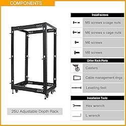 ADJUSTABLE DEPTH: The 19 inch adjustable server rack can be moved forward or backward to adjust the mounting depth from 20” to 30 “ that accommodate a wide range of 19” standard networking devices BUILD TO LAST: All-rivet structural connection with sturdy 2.0mm thickness cold rolled steel, this heavy duty server rack features 3” load-bearing casters which can withstand static load 1700lbs, and leveling feet supporting up to 1200lbs BROAD USAGE: The adjustable network rack with wheels is great choice for studio,office,AV,HIFI,home server,test lab,home lab,data centre,home theater,network switch, UPS and other 19” IT devices ALL HARDWARE ARE INCLUDED: 25U open frame rack comes with all hardware including m6 screws,m5 screws,cable management rings,casters,leveling feet and installation tools that can make the assembly easy and quick STURDY PACKAGING: Provide double boxed packaging and ensure that it is not damaged during transportation