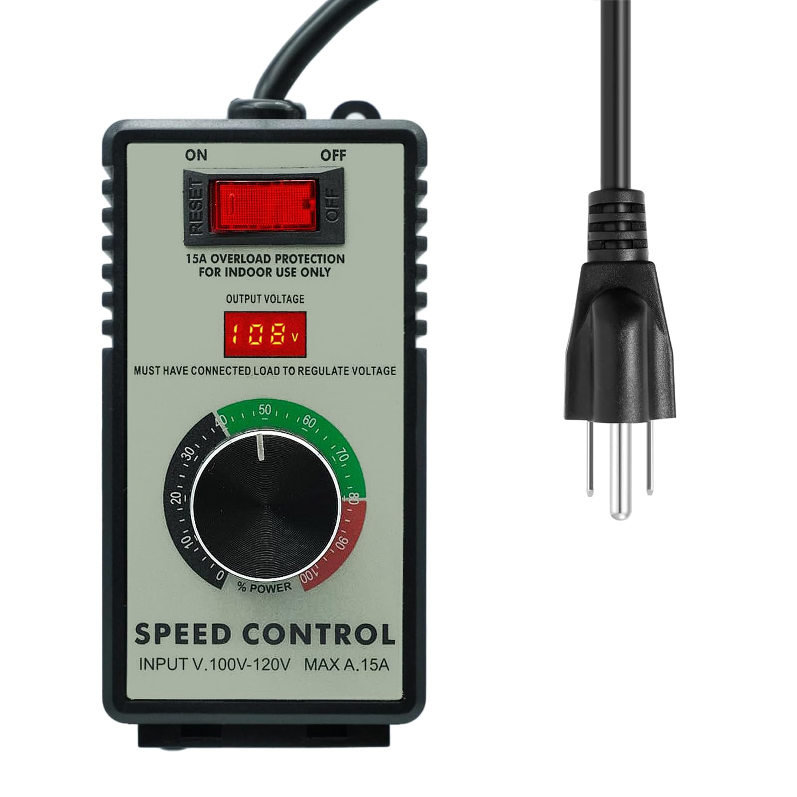 Product Parameters: Input voltage: AC 100V-120V; Input maximum current: 15A; Rated current: 9A; Resistive load: Max 4000W; Inductive load: 1500W max Hook design, Easy to carry: The back of the speed controller is designed with a hook for easy operation, through which the regulator can be hung the tool bag or belt, more convenient to use and carry, plug and play Overload and Overvoltage Protection:The variable speed controller has overload protection and overvoltage protection functions.When the instantaneous current exceeds 15A, the switch will automatically cut off the power supply to protect the controller. There is also an indicator light inside the switch,you can know the working status of the switch at any time Adjustment Knob:There are 3 levels of control speed changes: low, medium and high speed, which can meet the speed requirements of equipment in different application scenarios and ensure that the equipment or system is always in the final state of operation Wide Range of Applications: Speed controller is fit for US standard Type A, Type B plugs , and can adjust the real-time power of electric tools. Suitable for adjust electric fans, halogen, electric furnaces, angle grinders, marble machines, blowers, heater etc. Not suitable for electrical appliances with built-in circuit boards or capacitors, such as water pumps, microwave ovens, induction cookers, rice cookers, LED bulb, etc