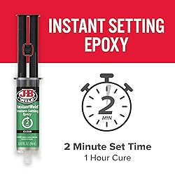 - J-B Weld InstantWeld is an instant-setting epoxy adhesive that bonds stronger than superglues and works on a wide variety of surfaces! InstantWeld sets in 2 minutes and cures clear to strong permanent bond! InstantWeld includes self-mixing static mixer allowing for a no mess precise application!
