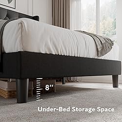 Upholstered Bed Frame: This wingback bed frame features a soft and comfortable button tufted headboard that you can easily lean against. The winged sides not only secure your pillows but also provide a convenient shelf on top, perfect for placing glasses and phones, making it both practical and functional Heavy-Duty Platform Bed: This platform bed boasts 8 contact points and a sturdy steel frame, capable of effortlessly supporting the weight of 2 adults and 2 large pets. It provides reliable support for up to 800 LBS Silent Design: To ensure a quiet sleeping experience, the tufted bed frame uses Velcro-secured wooden slats and noise-reducing strips to minimize friction noise, eliminating squeaks and unnecessary movement. Enjoy quiet and stable sleep every night Ample Storage Space: The platform bed with headboard offers 8 inches of clearance underneath, maximizing space and adding practicality for storing household items. Ideal for homes with limited space, it helps keep your bedroom tidy and organized Easy Installation: Designed for user convenience, this bedframe is straightforward to assemble without complex tools or professional skills. Detailed instructions and installation tools ensure you can quickly and easily set it up, ready to enjoy the comfort of your new bed