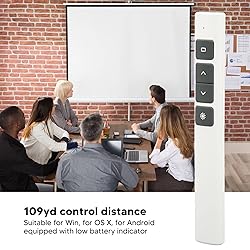 Plug and Play: This pointer supports plug and play, and software is not required, providing great convenience. Multi Function: This presentation click pointer integrates multi functions, such as hyperlink, up/down page turning, full screen, blank screen, Enter and more. 109yd Control: This pointer pen is designed with advanced chip which supports up to 109yd control distance. Widely Compatible: This presentation clicker is suitable for Win, for OS X, for Android. Powered by 1 x AAA battery(not included). Low Battery Indicator: This Wireless presenter is equipped with low battery indicator, ideal tool for teaching and meeting.