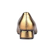 - Introducing our latest flat shoe with a 1 inch heel. Featuring a gold tone metal capped squared off pointed toe and a unique geometric square heel with rounded edge trimmed in gold tone metal, this shoe exudes elegance. Crafted with high quality materials that rival genuine leather, it offers the same luxurious look and feel. Whether you are dressing up for a special occasion or need an impressive professional look, this shoe is perfect. Walk confidently in stxle and comfort with our exceptional flat shoe.