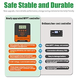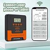 ☀️【Advanced/efficient tracking technology】Built-in maximum power point tracking algorithm that can track the peak power of solar panels in real time and extract it to charge the battery. Compared to traditional PWM controllers, this MPPT solar charge controller increases efficiency by over 30%, with a conversion efficiency of 99.9%, improving charging efficiency and extending battery life. ☀️【60A MPPT Solar Charge Controller】 Our MPPT controller features a high - ampere capacity of 60A and automatically recognizes system voltages of 12V/24V, and is compatible with solar panels within the 18 - 100V range. Ideal for both residential and industrial solar setups, it powers any device stably. ☀️【Battery Versatility】 Our Solar Charge Controller is compatible with LiFePO4, AGM sealed gel, and flooded lithium batteries. You can freely select the most suitable battery for your requirements without any compatibility concerns, ensuring efficient energy storage and a reliable solar power system. ☀️【Smart Solar Control & Dual USB Charging】 Remotely manage your solar system via WiFi/Bluetooth on our intuitive app, tracking charge status and total energy production. Dual USB ports enable direct solar charging for phones and tablets, perfect for outdoor adventures or emergency backups. ☀️【Safety features】 This solar panel controller has a current limiting charging mode that ensures the charging current reaches the rated level when the panel power exceeds a certain level and the charging current is delayed. It also has comprehensive protections including overvoltage, short circuit, reverse connection, reverse charging, over temperature, and TVS lightning protection.