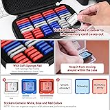 High Capacity: This memory card case stores 24 SD/SDHC/SDXC cards & 24 TF/MSD/MicroSDHC/MicroSDXC cards with individual transparent plastic card holders (Memory cards are NOT included), meet your daily memory cards storage needs. Double protection: Made of EVA and PU materials, which are comfortable & durable, effectively reducing the risk of data loss caused by SD/TF card collision damage; With waterproof zipper, waterproof and oil proof; The plastic transparent case is equipped with a snap on cover, which has ideal sealing performance. (Note: The zippers may experience some stuttering when opened, but it does not affect normal use!!!!) Multi-Color/Clear Case:It comes with transparent SD/MSD card holders in clear, red, and blue colors to meet your different color preferences. The contents of the memory card can be classified according to color. The package also includes a label sticker and a number sticker, making it easy to organize the memory cards, and providing more convenient and orderly storage. Strictly Tailored:The internally customized EVA foam has a shock absorption function and independent vertical style storage, which can prevent small card cases from touching and scratching each other. The top cover of the holder is equipped with a zippered pocket, which can store small items such as camera batteries, data cables, card readers, etc.(Note: The inner foam is detachable and can be taken out as a storage bag for travel and outings!) Easy to Carry:The rubber handle can easily lift this memory card case; It also includes a wrist strap that you can fasten to the D-shaped buckles at both ends of the case as needed, making it easy to carry during shooting, which is very convenient for your outdoor shooting activities.