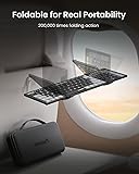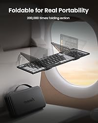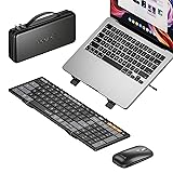 【One Portable Kit for Better Setup】The next generation of XKM01 Combo for Travel Business, better posture and more productivity. Come with a premium travel case, inside includes a folding keyboard, ultra-thin mouse, adjustable laptop stand, and charging cable, ensuring all these travel work essentials are carried compact. Meeting the extreme requirements for flexibility and portability of on-the-go professionals and remote workers 【Healthy Posture, Comfier Days】A laptop stand effectively elevates the laptop's viewing angle to eye level, reducing the neck strain and fatigue caused by prolonged head-down work. Build a workspace for wellness wherever you are using in coffee shops, co-working spaces, office or home 【Innovative Foldable Keyboard】The tri-fold wireless keyboard folds into a smaller size(8.46 x 4.68 x 0.78 in), significantly saving carrying space. This design not only facilitates portability and storage but also allows you to quickly unfold the keyboard to start work at any time and place, and power off automatically upon closure, truly realizing the freedom of mobile office 【Multi Device Workflow】Adopts 2.4G and Bluetooth dual-mode connectivity technology, the travel keyboard and mouse compatible with a wide range of devices and providing seamless switching. Whether you're typing up documents or navigating your device precisely, this combo delivers convenience without sacrificing performance 【Get the FULL Typing Experience】Keyboard equipped with quiet scissor switches 16.5mm size keys, features a number pad and separate row of shortcuts. Enjoy the laptop-like typing feel you know and love with few errors 【USB C Charging】Bulit-in rechargeable battery, both the bluetooth keyboard and mouse can recharged via the included Type-C cable, providing convenient power charging. Additionally, an auto-sleep feature conserves battery when not in use, allowing for an impressive 150 days of keyboard standby time and 200 days of mouse standby time