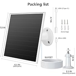 【Compatibility】:The solar panel charger comes with Micro USB/USB-C interfaces for rechargeable battery security cameras. The solar panel outputs DC 5V and is not compatible with cameras having other ports.The compatible models are introduced in the details (A+) section. 【High Efficiency】:With 23% high-efficiency shingled monocrystalline silicon and a larger 6W panel, this fast charging solar panel for cameras achieves higher efficiency. It generates more power ,keeping outdoor security cameras perpetually charged. 【All-Weather Durability】:It has IP65 waterproof and dustproof functions, preventing moisture, rain and dust from damaging the equipment. It can adapt to the temperature range from -5 ℉ to +120 ℉, and has a longer service life. 【Cable Length and Mounting】:The 360° adjustable mounting bracket can flexibly turn the solar panel towards the sun. The charging cable, which is about 10 feet long, allows you to place the solar panel randomly in sunny areas. 【Easy to Install】:Complete installation accessories are provided. You can install the solar panel with just 3 screws. The package includes: 6W solar panel, 360° adjustable mounting bracket, screws kit, manual, Micro USB/USB-C interfaces. 【Important Note】:This solar panel is not compatible with EUFY cameras.