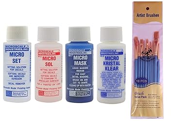• Microscale Industries Bundle with Micro Set, Micro Sol, Micro Mask, Micro Kristal Klear, 1 oz. bottles (Pack of 4), and Make Your Day Paintbrush Set Includes One of Each Item: Micro Set (MI1), Micro Sol (MI2), Micro Mask (MI7), Micro Kristal Klear (MI9), and Make Your Day Paintbrushes Micro Set: Prepares the surface and enhances the adhesive properties. Micro Sol: Completely softens the decals in order for them to conform perfectly to any irregular surface. It makes the decal a part of the painted surface Micro Mask: Micro Mask is masking tape in a bottle. Just apply it with a brush, let it dry, and cut it to any shape you want with a sharp-pointed knife. Peel out the part where you want to paint, leaving an outer stencil mask, and paint with the method you prefer. Micro Kristal Klear: Can do so many things that can make a big difference in the appearance of your models. First, Micro Kristal Klear is a liquid that can be used to form very real looking small windows up to about 1/4 in size. It is also an adhesive for mounting clear plastic parts, windows, etc. on models. Make Your Day Paintbrushes: Achieve precision and creativity with our 10-piece paintbrush set, offering a variety of sizes for all your artistic needs.