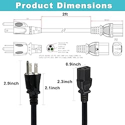 PRODUCT SPECIFICATION: Wire Gauge: SJT 16AWG/3C. Rated to carry: 125V at 13A,1625W. Length: 2FT. Connector: NEMA 5-15P to IEC320-C13. Package List;2PCS Versatile: 2 pack of 2FT PC Power Supply Cables for connecting computer, printer, monitor, speaker, and more. Compatibility: NEMA 5-15P to C13 connector, compatible with most desktop computers and peripherals. Durable Construction: Crafted with 16AWG wire and rated for 13A at 125V, this monitor power cord ensures reliable and long-lasting performance. Convenient Length: 2FT length provides flexibility in cable management and positioning. Versatile Usage: Whether for home or office use, this 3prong ac power cord is suitable for various electronic devices requiring a standard 3-prong AC power connection.