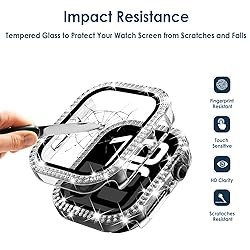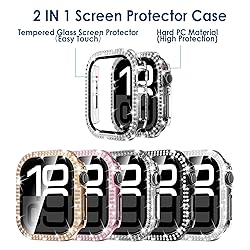 Perfect Design --- Compatible with Apple Watch 38mm 40mm 41mm 45mm Series 11 42mm 46mm (Smart Watch not included) 2 in 1 BLING Crystal Case & GLASS Screen Protector --- Hard slim case keeps your watch lightweight and easy to install. The jewelry bling rhinestone adding a brilliant array of sparkles. Built-In screen protector resists the hardest scratches and impact, feel smoother, more fluent operation, and will never hurt your fingers.( Charger without take off the case) 5-PACK for Your Choice --- Come with 5-Pack case, Black, Rose gold, Silver,Clear, Rose Pink, different watch case to match the diffferent color watch bands Perfect Fit and Excellent Protection --- The screen, power button, digital crown and the speaker can fit without having to remove the case, while still having total functionality of the buttons. Every button and hole opening was thought out carefully 2 Year Customer Service - Friendly customer service to make our customer satisfied