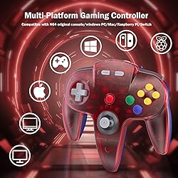 ⁂ 【Wide Compatibility】Wireless controller compatible with a variety of platforms, including Original Nintendo 64 System and Switch Console (Switch, Switch OLED, Switch Lite), Windows PC/MAC or Raspberry Pi. Connection modes: 2.4G Wireless USB Dongle/N64 receiver. ⁂【Classic Design】ERGONOMIC DESIGN HANDLE, Classic N64 style with "M" shape ,designed to fit your hands nicely, all the buttons and controls make your hand very comfortable for long periods of gaming. It is a great choice if you hope to play these classic N64 online games ON switch console. ⁂【Wireless connection】2.4GHz Wireless technology and wireless range up 25 feets,that is better than having to sit on floor a foot away from the TV. Great battery life, built-in 500mah high-performance lithium batteries and only takes 3 hours to charge and can work for up to 20 hours and more. ⁂【Precise joystick and motor shock Vibration 】Precise 3D-high quality analog stick, built-in rumble Pak and memory card port, compatible with most of game memory cards. you can use a memory card and transfer to an SD card. Only when you use it on N64 console or PC running project 64 emulator, the vibration function is valid. ⁂ Third party controller, not original controller. It is a great choice if you hope to play these classic N64 online games ON switch console. And you can play most of retro N64 games very well, such as Mario Party game,Zelda N64,okémon Snap, Star fox, Smash Bros, Kirby, Glover or any other N64 games in the 90’s. Notice: For Switch, "Pro Controller Wired Communication" must be enabled before pairing.