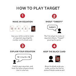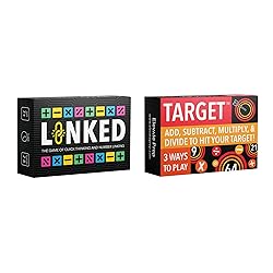 • This bundle comes with two of our best-selling, equation-making math games, Target and Linked. Target is a fast-paced game where players race to use the cards in their hand, along with addition, subtraction, multiplication, and division, to create an equation equal to a target number. Players keep the cards of the target numbers they create, and the first player to collect 5 cards wins! It's perfect for 2-6 players ages 8 and up and comes with three difficulty levels and three ways to play. Linked is a game of quick thinking and number linking. In this fast-paced game, players compete to find an equation equal to a target number that is hidden in the 16 cards on the board. But there's a catch: the cards used in your equation must be linked horizontally, vertically, or diagonally. Think of it like Boggle, but for math! Linked is perfect for 2-8 players ages 7 and up, and comes with two difficulty levels: one level only involves addition and subtraction, and one level involves addition, subtraction, multiplication, division, and even exponents! It also comes with multiples ways to play and various game modifications for e