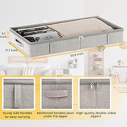 ⭐️【PERFECT CAPACITY】- 33.8"L x 17.7"W x 5.1"H and each underbed storage 5 inches high holds 50 liters, that's one large under bed storage plastic or more than 25 articles of clothing. Shoe storage under bed organizer designed to fit most under bed clothes storage, maximizing clothes container potential ⭐️【3 TIMES STURDIER】- High-end quality under couch storage, dense fabric makes these fabric under bed drawers 3 times sturdier than normal under bed shoe storage or under bed storage drawer, which is worth the extra money ⭐️【LINEN HIGHT QUALITY MATERIAL】- Underbed storage containers are made from high-quality, odorless linen fabric, durable and breathable, can store out-of-season clothes during long-term storage. The sides are strengthened with cardboard inserts that hold their shape and have a folding, cardboard-reinforced bottom. ⭐️【REINFORCED HANDLES SEWN UNDER THE ZIPPER】- Wide, double-stitched with thick fabric and additionally reinforced by sewn-in zipper handles for comforter storage with lid, very durable to pull out from under the bed and move around the house, reliable for continuous and long-term use. ⭐️【TRANSPARENT LID & STURDY ZIPPER】- 5 inch under bed storage bins with lids for easy item visibility and quick access. Ideal blanket organizers and storage, shoe organizer under bed, storage containers for clothes or clothing storage bins