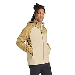 Men's zip hooded rain jacket with inner cap for hiking in wet weather REGULAR FIT: Wider at the body, with a straight silhouette FULLY WATERPROOFED: adidas RAIN.RDY uses advanced waterproofing to channel the rain away from your body WATER REPELLENT: A durable, PFC-free water-repellent (DWR) finish sheds light rain and snow MADE WITH RECYCLED MATERIALS: This product is made with 100% recycled materials. By reusing materials that have already been created, we help to reduce waste and our reliance on finite resources and reduce the footprint of the products we make