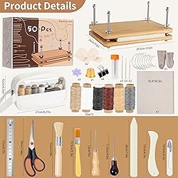 • What you get: book binding kits consist of 50 products; including; 1 book press, 5 spools of waxed floss (each spool is approximately 164 feet long), 1brush, 1 ruler, 12 needles, 1 awl, 1 pair of scissors, 2 bone cutters, 1toolkit, 3 pieces of book cloth , 1 roll of linen Binding Adhesive with 1 Trigger Fi
