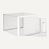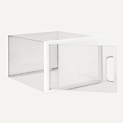 12-pack of stackable, interlocking shoe organizer boxes for versatile, space-saving storage — ideal for shoes, clothing, handbags, toys, accessories, and other household essentials Fits men's shoes up to size 9.5, women's shoes up to size 11, and all kids’ shoes – fit varies by shoe style Clear shoe storage boxes made with durable, transparent PET plastic for easy visibility of contents Unique hollow handle design with breathable back panel provides enhanced ventilation Quick assembly with vertically stackable shoe storage locking clasps to keep boxes in place