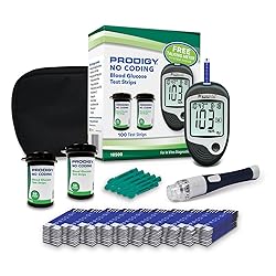 PRODIGY 10500 100ct Test Strips with AutoCode Talking Meter Starter Kit, PRODIGY AutoCode Blood Glucose Talking Meter, No Coding Blood Glucose Test Strips (2 vials of 50ct), Adjustable Depth Lancing Device, Twist Top Lancets 28G (10ct), Carrying Case, Quick Reference Guide, Owner's Manual