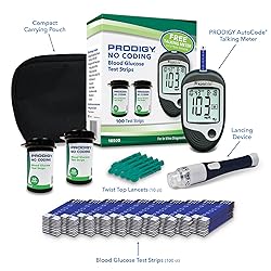 - This convenient and affordable All-in-One Starter Kit is thoughtfully designed to provide everything you need to begin monitoring your blood glucose levels with ease. It includes the PRODIGY AutoCode Blood Glucose Talking Meter, two 50-count vials of PRODIGY No Coding Blood Glucose Test Strips, a PRODIGY Adjustable Depth Lancing Device, 10 PRODIGY Twist Top Lancets (28G), a durable carrying case, a quick reference guide, and an owner’s manual. Delivering a complete solution for effective blood glucose testing and management.