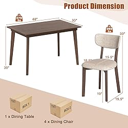 - Description: Elevate your dining experience at home with our sophisticated dining table set. This 5-piece breakfast nook table set includes a spacious rectangular table and 4 cushioned dining chairs, perfect for cozy family dinners or entertaining guests. Crafted with sturdy rubber wood legs, the dining table ensures robust support while the wide tabletop easily accommodates your meals and dining essentials. The chairs are designed for comfort with durable, stain-resistant upholstery, and their space-saving feature allows them to neatly tuck under the table, ideal for compact living spaces. Embrace the perfect balance of style and functionality with this versatile dining set suitable for your living room, dining area, or even a stylish restaurant setting. Features: Spacious 48” x 30” tabletop for ample dining space Upholstered dining chairs with comfortable padding for long meals Sturdy rubber wood legs for stability and durability Wear-resistant wood grain veneer for easy upkeep Space-saving design with chairs that can be stored underneath Versatile dining set suitable for living rooms, dining rooms, and restaurants Triangular structures for enhanced stability and support Each chair can support up to 265 lbs for reliability Easy assembly and low maintenance for hassle-free use Box 1 includes a table and box 2 includes 4 chairs Specifications: Color: Brown+Light Brown Material: Rubber Wood, MDF, Linen Fabric, Sponge Table Size: 48” x 30” x 30” (L x W x H) Chair Size: 18.5” x 19.5” x 33” (L x W x H) Seat Size: 18.5” x 15.5” (L x W) Seat Height: 19” Weight Capacity of the Table: 275 lbs Weight Capacity of Each Chair: 265 lbs Net Weight: 83 lbs Package Includes: 1 x Dining Table 4 x Dining Chair 1 x User’s Manual Why You Choose Our Dining Table Set? The thick padded seat and back cushions provide a comfy sitting experience. The veneered MDF tabletop features a waterproof and easy-to-clean surface.
