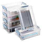 Plastic Extra Large Pencil Boxes: Exterior Dimensions: 8.3"L x 5.5"W x 2.7"H,Interior Dimensions: 7.7"L x 4.7"W x 2.4"H. This hard pencil box is deeper than the standard pencil box in markert. Comes with 6 pack stackable pencil boxes, holds lots of items, such as Holds 180+ pencils, 120+ pens, 100+ markers, or 250 crayons, and extra room for other accessories. Widely Use: Pack of 6 meets your daily needs, which are sufficient for a variety of uses such as desks, offices, art supplies, and more; These plastic storage containers are perfect for organizing pencils, stationery, office supplies, art materials, and miscellaneous items. Stackable & Portable Design: The clear pencil box features a stable stackable design, which maximizes space utilization and keeps your desktop neat and organized. The slim, space-efficient shape fits easily into most desks, drawers as well as backpacks and briefcases, lightweight and portable. Secure Snap-tight Lid and Handles: With bilateral secure latch handles that securely fastens the lid. The well-made latches makes it easy to open and close. The tight-fitting lid keeps the art supplies for a secure hold when it falls. Clear & Sturdy Material: Constructed with quality plastic and exquisite workmanship, the pencil case organizer is super sturdy, strong and sturdy to store and protect your items for a long time. It will be around for many years to come! The transperant material allows for easy item retrieval.