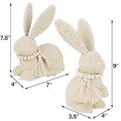 Exquisite Handmade Easter Bunny Duo: These two adorable bunnies Easter figurines are crafted from high-quality beige cotton rope, handwoven to perfection. One bunny statue stands tall (9 inch), while the other playfully rests (7.5 inch). Ideal for any Easter decor, they bring charm and elegance to your holiday decorations. Unique Aesthetic Design: Adorned with white wooden bead necklaces and long flowing tassels, these Easter bunny figurines exude a rustic, bohemian vibe. The thoughtful details and handcrafted charm make them a standout addition to your spring home decor. Versatile Spring & Easter Decorations: Suitable for table displays, mantels, or shelves, these small bunny decorations fit seamlessly into any room. Their neutral tones and minimalist design enhance both modern and farmhouse-style Easter decorations for the home. A Symbol of Easter Festivities: With their intricate handwoven patterns and playful tassel accents, these cute bunny ornaments capture the essence of Easter. Whether placed on a tabletop or as part of a spring centerpiece, they add a touch of joy and elegance to your space. Thoughtful Gift for Easter Celebrations: These handmade Easter bunny figurines are a heartfelt gift choice. Suitable for family or friends, they symbolize love and craftsmanship, making them a special keepsake for Easter and springtime gatherings.