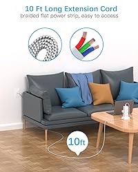 【16 IN 1 Charging Station】- This power strip tower with 12 AC outlets(1875W/15A) and 4 smart USB (2 USB C) charging ports can power up to 16 electronic devices simultaneously. Integrated circuit breaker and 1080 Joules protection rating ensure the safety of your electronics. 【10Ft Flat Extension Cord with Multiple Outlets 】- Only 0.35 inch flat wall plug is thinner than traditional plugs, which can close to the wall easily, fits tight spaces behind sofa. 45° right angle plug design prevents other plugs blocking. The 10 ft long extension cord is made of pure copper, which is very thick and has better current carrying capacity .The braided fabric makes it tangle-free, flexible and elegant. The home office, college dorm room essentials you must haves. 【Power Strip With USB C Ports, Charge Up to 30% Faster 】- Dual USB A ports features 2.4A, the USB C port features 3A; 2 types of USB ports can detect charged devices and deliver optimal charging speed, built-in smart technology, detecting charging devices and deliver optimal charging speed automatically, giving you more charging options; Compatible with iPhone, iPad, AirPods, iWatch, Cell Phone, Tablet, Speaker and etc. 【Power Strip with Surge Protection & Overload Protection】- The surge protector tower with overload protection protects against spikes and fluctuations. The reset/off switch with integrated circuit breaker for overload protection of all outlets. This surge protector power strip has overload protection, short-circuit protection, over current protection, over-voltage protection and overheating protection. Fire-resistance PC shell with flame retardant at 1382℉ makes it more safe and longer lifetime. 【Space Saving Vertical Power Strip】 - With 4-side vertical tower design, this usb power strip takes up little space on your desk, cleans various cords and make your desktop organized. 12 AC outlets with long space in between, it easier to use for all kinds of equipment and without blocking each other.