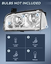 Compatibility: 2006-2010 Dodge Charger Headlamps+Side Marker Lamps; High beam: HB3 bulb; Low beam: HB4 bulb; Turn signal light: 3157NA bulb; Note: Bulbs are not include Durability: The high-impact housing withstands shock and vibration. With fully sealed silicon prevents environmental damages including freezing, foggy, fading, corrosion, and provides reliable service in sorts of weather conditions such as rain, snow, or dust storms, enabling your car looks better and drive safer DOT Compliance and safe Driving: To ensure driving safety for you and the oncoming driving circumstance, our 2006 2007 2008 2009 2010 Dodge Charger headlights are DOT & SAE compliant. Our headlights provides clearer and further vision to see the wild animals, falling rocks or other obstacles at night. Reduce the possibility of danger Simple Installation: Plug-and-play operation, direct bolt-on OE fitment and replacement for the stock headlight, easily for installation without any drilling or modification Package Includes: A pair of Headlights for 2006-2010 Dodge Charger, user manual