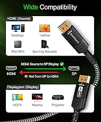 ➤ UNI-DIRECTIONAL HDMI to DP CABLE: BlueRigger HDMI to display port cord supports 4K 30Hz and is compatible with HDMI, 3D, HDCP 2.2, HDR and DisplayPort with backward compatibility. Supports Variable Refresh Rate (VRR) and Auto Low Latency Mode (ALLM), QFT, QMS and FEC. Enjoy smooth and reliable transmission on your HDTV or monitor ➤➤Note: This is a unidirectional cord and DOES NOT support DisplayPort to HDMI transmission ➤ HEIGHTENED VIEWING EXPERIENCE: Easily connect your laptop to monitor with this computer monitor cable. BlueRigger HDMI source to displayport output cable delivers lossless high definition video and flawless uncompressed audio pass-through across channels at 7.1, 5.1 and 2.0. The cable also supports Mirror Mode, Extended Mode and Game Mode, making it easy to expand your workstation ➤ SUPERIOR BUILD: BlueRigger HDMI source to displayport monitor cable is constructed with an aluminum alloy shell and multi-layer shielding to ensure optimal signal transmission and minimize EMI/RFI interference. The 24K gold plated connectors and cotton braid increase corrosion resistance and durability ➤ WIDE COMPATIBILITY: BlueRigger HDMI to DP audio video cable is compatible with Desktop, Laptop, PC, Gaming Console (PS5, PS4, PS3, Xbox), Mac Mini for the HDMI, and TV, Projector and Monitor for the display port ➤ LIFETIME WARRANTY: BlueRigger Lifetime Warranty and US-based Customer Support