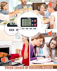 [2 Channel Timer, Precise Timing]: This multi-timer can independently run dual timers, perfectly meeting your needs for timing multiple dishes simultaneously. The digital kitchen timer is accurate to the second. As a cooking timer, it offers a maximum timing duration of up to 9:59:59 [Easy to Use and Read]: The large display screen is clear and easy to read. Simple operation allows you to quickly master the countdown and count-up timer functions. For more advanced features, such as loop and alternate countdowns, we provide detailed instructions [Adjustable Volume]: Choose from three volume levels—high, low, or mute—to find the perfect alarm setting for your needs. This versatility makes it an excellent kitchen timer with alarm functionality, and it's also ideal for workouts, tea timing, and time-outs [Strong Magnetic Back, Multiple Placement Options]: The back features three powerful magnets that can firmly attach to your refrigerator, making it an excellent magnetic digital timer. With a retractable stand and hanging hole, this Dual Kitchen Timer offers versatile placement options, allowing for flexible use in various settings [Replaceable AAA Batteries, Power Off Feature]: Powered by 2 AAA batteries, it provides 3-6 months of battery life even with frequent use. When not in use, simply press and hold the power/volume button to enter standby mode, effectively extending battery life