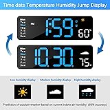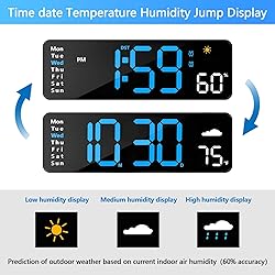 11 IN Digital Clock Large Display: The digital wall clock has a large screen display with high clarity and clear numbers, it is very easy to read even from a distance and from all angles. The LED clock gathers many function: time, week, date, 12/24Hr, dual alarm, DST, temperature and humidity jump display etc. Tips: The wall clock must be plugged in to work, not include adapter. The battery power only works for storing the clock setting in the case of main power outage 10 Levels Brightness Dimmer: With 10 levels adjustable brightness display, you can easily adjust to a comfortable brightness manually by using the remote control. The LED digital wall clock has a built-in automatic dimming sensor, which can also automatically adjust the brightness as the light changes, not to disturb your sleep, smart to provide you with the needs Memory Function: The alarm clock also has a time memory function, no need to reset after power outage (2*AAA batteries need to be installed in advance), this way you won’t oversleep or worry about resetting the time when power outages Remote Control: This practical LED clock have the remote control(not include battery), and there is no pressure when setting the time or alarm clock, all the settings and operations of the LED alarm clocks for bedrooms can be easily done using the remote Dual Alarm Clock and DST: The alarm clocks for bedrooms are two separate alarms and three alarm modes to choose from: Monday to Friday, Monday to Saturday, or Monday to Sunday, loud alarm clock for heavy sleepers adults. With DST, your digital clock for classroom seamlessly transitions between standard and DST, ensuring you're always in sync with the official time change Timing Function: This large digital wall clock has a count-up or count-down function (up to 99 minutes and 59 seconds), very suitable for doing yoga or working out Modern and Functional: Rich functions to meet the needs of daily life. The large digital wall clock can be placed on the desk or hung on the wall, are suitable for bedroom, living room, classroom, kitchen, office, gym, shop, warehouse etc, also the practical gifts for friends, partner and the elderly. If you have any question with our digital clock, simply let us know