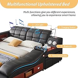 【Luxury Multifunctional Bed】Our new generation of multifunctional bed integrates massage, entertainment, storage and lighting, allowing you to enjoy a comfortable smart home life and enjoy the ultimate experience before falling asleep every night! which will make your bedroom your favorite place. 【Ergonomically Designed Massage Recliner】Our luxury Bed Frame with a massage recliner on the left side of the bed. Its wavy design fits the curve of the body perfectly. It can be controlled by the remote control to provide a soothing and gentle massage for your back, helping you relieve a day's fatigue and muscle soreness. 【Powerful Entertainment Center Console】We have equipped you with 2 high-quality Bluetooth speakers on one side of the multifunctional bed, so that you can freely enjoy soothing and relaxing music before going to bed; and there is also a USB charging station and an LED light to provide you with night lighting. This bed can perfectly meet your needs with all the functions you need! 【Solid & Sturdy】 The bed frame and slats are made of solid pine wood, which is hard, firm, corrosion-resistant, and not easy to deform or crack, ensuring a long service life. The bed slat structure consists of solid wood, with 10 widened & Thickened slats, providing dense and powerful support for weights up to 1000 pounds. The scientifically designed solid wood feet withstand pressure and offer sturdy, stable support without deformation. 【Easy Assemble & Service】Please note this product does not include a mattress. This bed frame requires a simple assembly, with all labeled pieces, installation tools, and clear instructions. Tips: This product includes six packages, and the deliveries may arrive on different days. If any concerns occur with this bed, please feel free to contact us.