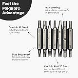 Ball bearing allows bit to pressure-fit in driver shaft. Durable S2 Steel industrial grade and built to last. Size Engraved for quick and easy bit identification. Double end 2" bits provide two different drive tips per bit. Purchase of this product in the USA or Canada supports MEGAPRO’s “Feed the People” Program.