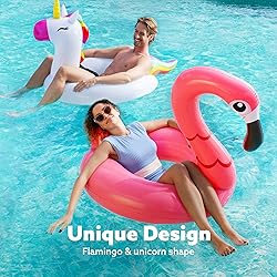 - Playful Design for Endless Fun. Featuring vibrant flamingo and unicorn designs, these inflatable pool floats are perfect for summer parties, beach outings, or simply relaxing poolside. Kids and adults alike will enjoy the whimsical touch they bring to any water activity. Their delightful look makes them a fun choice for photos, pool parties, or gatherings with friends and family. Value-Packed Combo Set. This set includes both a unicorn and a flamingo pool float, offering great value with two unique float tubes that ensure hours of enjoyment. Perfect for pool games, summer parties, and celebrations, these floats are also great for gifting or enhancing pool decor. High-Quality and Durable Material. Made from premium PVC, these floats are crafted with thick, high-quality vinyl that’s non-toxic, providing a safe and long-lasting water experience. Built for durability, these floats will withstand extensive use, promising many seasons of fun. Generous Size with Great Buoyancy. With a large 42-inch diameter, these floats are designed to support both kids and adults comfortably. They offer excellent buoyancy and stability, allowing you to lounge, float, and relax in the water with ease. Quick and Convenient Inflation. Equipped with rapid-inflation valves, these pool floats are easy to set up and deflate five times faster than traditional valves. Their lightweight and compact design also makes them easy to store and carry, perfect for any summer adventure.