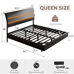 Dreamy Floating Design: This Floating queen size bed frame with chic wooden headboard, supported by inside legs on the reinforced main frame, ambient light spills from LED light strips under-bed (21ft) and behind the headboard (6ft), The LED lights enjoy a quiet and dreamy vibe Hidden Tranquility LED Lights: Equipped with 1 RGB light strip by velcro falling less fixed attached under the bed and 2 hidden light strips behind the headboard. Over 60,000 colors can be self-choiced by APP or remote. Multi-mode selected by yourself as Music Mode, Mic Mode, and Timer Function, etc Enhanced Ergonomic Design: The aesthetic undulating design of the headboard offers multiple points of contact, allowing for better support and alignment of the spine, neck, and shoulders. Reduce your strain and discomfort, promoting overall comfort during backrest Storage & Charging Easily: Built-in regular charging station ( 2 AC outlets & 1 Type A and USB ports ), making your phones, tablets, and headphones always online. Tilt angled headboard with 4" storage space allows you to store items within reach Safety Reinforced Structure: Adopt a stable triagonal structure to support this queen metal bed frame, the embedded legs and sides board prevent bumping toes. Besides, the reinforced metal frame with 11 steel slats and 6 thick leg supports, provides lasting stability Easy Assembly & Noise-Free: Everything is packaged in one box. EVA material holds the slats and frame in place without creaks or noise. Buckle design and clear instruction and tools, make you effortless setup