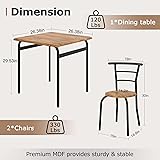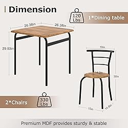- VECELO 3 Piece Dining Table & Chairs Set for 2, a versatile and space-saving solution for small kitchens or dining areas. This compact dining set is perfect for apartments, breakfast nooks, or even dorm rooms. Made from a combination of sturdy metal and high-quality MDF, this dining table set ensures durability and long-lasting use.This set includes a square dining table and two chairs, all designed to fit snugly into smaller spaces without sacrificing style or functionality. Modern design and neutral color scheme, this kitchen dining set will seamlessly blend with any existing decor. Whether you're enjoying a cozy dinner for two or hosting a small gathering, this dining table set provides the perfect setting.Product Specifications:Color: Brown and GreyMaterial: MDF+MetalDining Table Size: 26.38"(L) x 26.38"(W) x 29.53"(H)Chair Size: 15."(L) x 14.8"(W) x 30"(H)Item Weight: 34.17poundsPackage Includes:1 x Square Dining Table2 x Chairs1 x Instruction1 x Accessory BagTips:Please read the instruction carefully before assembly.Please align all bolts with screw holes and then tighten them. DO NOT fasten one thoroughly first and then the other, which would cause the chair unstable.