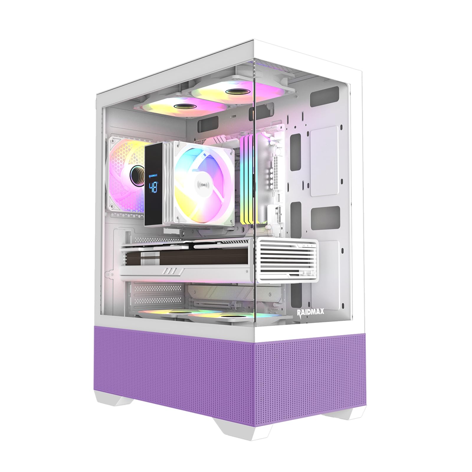 - Make your build stand out with the RAIDMAX i802 VIBE, a compact yet powerful ATX mid tower gaming case with bold color, full visibility, and serious airflow. Designed with a panoramic tempered glass side panel, this case lets you show off your components and lighting from edge to edge. The i802 VIBE comes pre-installed with 5x fixed RGB fans, delivering vibrant lighting and efficient airflow without the need for controllers or software. Despite its compact footprint, it supports high-end GPUs up to 400mm, 240mm front-mounted liquid coolers, and standard ATX motherboards — making it the perfect blend of size, style, and performance.