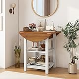 [Ample Storage Space] This stylish table features a wide tabletop for everyday dining and entertaining, while its 2-tier storage shelves offer a versatile solution for your kitchen or dining room needs. Store your favorite foods, wines, cups, bowls, and decorations below, ensuring easy access and a tidy appearance. [Drop Leaf Design] Equipped with 2 drop leaves, this practical dinner table allows you to transform the dining table into a compact console table easily. When fully extended, the table offers a generous 40" width, perfect for hosting gatherings. After the leaves are folded, it measures 25", providing a cozy spot for daily use. [Wide & Elegant Tabletop] This modern dining table boasts a wide and elegant tabletop, crafted from high-quality MDF with a beautiful acacia wood veneer finish. Besides, the natural-looking surface is not only visually appealing but also wear-resistant and easy to maintain. [More Exquisite Details] Designed with safe rounded corners, this farmhouse table protects your family from the harm caused by bumps and collisions. Additionally, the solid rubber wood legs provide a sturdy foundation, ensuring the table's stability and durability. [Wide Application & Dimensions] This foldable kitchen table is not just a table, but a centerpiece that brings functionality and flair to your home decoration, it is designed to fit seamlessly into various settings, from dining rooms and living rooms to entryways and kitchens. The unfolding dimensions are 40" x 36"(Dia x H).