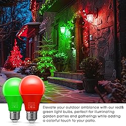 Red and Green Light Bulbs Outdoor : Illuminate your outdoor with these red green LED light bulbs. The red and green lights for Christmas adds a touch of brilliance to your surroundings, creating a captivating atmosphere for any occasion. Christmas Light Bulbs: Swap out dull white light for vibrant green bulbs and red bulbs to energize any party. Perfect for Christmas, special occasions, or as a nightlight, these bulbs add color and comfort to any setting. Energy-efficient: A19 led red and green porch light bulb are designed to be energy-efficient, helping you save on electricity costs 90%, lasts longer, while providing bright illumination. Easy Installation: These red green colored light bulbs are easy to install. They fit standard E26 sockets and can be effortlessly installed in your existing outdoor lighting fixtures. Durable and Reliable: Lower heat dissipation and higher light efficacy. If you have any questions about our red green outdoor light bulb, please feel free to contact us.