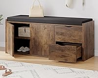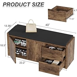 - Two Drawers & Hidden 2-Tier Shoe Rack This Rustic storage entryway bench combines a hidden two-tier shoe rack and two drawers Cabinet. Each tier of the shoe rack allow to hold 4-6 pairs of shoes. The shelf design with three adjustable heights setting, allowing for flexible storage options to accommodate tall boots or larger items. The two drawers are ideal for hats, clothes, keys, and other small essentials, keeping your space neat and organized Two Installation Options with Removable Cabinet Doors This storage entry way bench features a detachable cabinet door design, offering two installation options.When installed, the doors provide hidden storage, keeping your items dust-free while saving space and enhancing the aesthetic of your entrance. Without the doors, it’s easier to access your shoes at any time. The flexible design meets various storage needs and adapts to different preferences Suitable Size & Ample Storage Capacity Design In the realm of foyer bench, size matters significantly. This shoe Rack bench with the dimensions of 40”L x 13.39”W x 18.5”H. While not taking up too much of your living space, its hidden shoe cabinet and drawers provide you with enough storage space for daily life, Its spacious length allows two people to sit comfortably while changing shoes, with a weight capacity of up to 300lbs for stability and reliability. Beisdes, with a 1.97-inch (5cm) thick soft padded cushion provides a comfortable daily experience when you change you shoes Multifunctional & Fits Everywhere This storage bench suitable for various scenes such as entryways, hallways, living rooms, bedrooms, and can also be paired as a window seat with two units. Removing the cushion transforms it into a TV stand or storage cabinet. The vintage oak finish seamlessly blends with an industrial design, complementing modern, rustic, and retro decor styles, adding both functionality and charm to your home Convenient Assembly and Quality Assurance Convenient Assembly and Quality Assurance