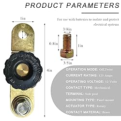【Reliable Quality】: The main material of this switch is zinc alloy and copper, the metal characteristics make this switch has greater strength, not easy to deformation and cracking. Its surface is treated with special plating, which is corrosion-resistant and not easy to rust. 【Highly Conductive】: We chose copper as the contact material for this circuit control master switch to make it work well. The highly conductive brass contacts make this switch more responsive and able to quickly turn the power on or disconnect the power. 【Protection Function】: This side post battery switch is used for battery isolation and protection. When your vehicle or boat is not needed for long, you can use it to cut off the power, stop any power consumption, keep it from leaking, and prolong the time of battery. 【Convenient Use】: The knob design makes this power disconnect isolator switch very easy to install and simple to use with a twist to control the circuit. Tighten the cap 4-5 turns to energize the circuit and loosen the cap 4-5 turns to disconnect the circuit. 【Widely Applicable】: The rated voltage of this battery is 12V, rated current is 100A, instantaneous current is 300A, it is widely used for 12V battery power supply of all kinds of cars, marine, boats, RVs, campers, trailers, trucks, ATVs, UTVs, or other battery pack equipment.