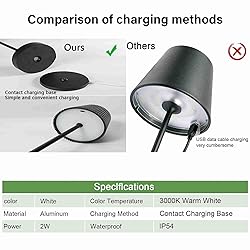 - 1. Minimalist Design: This table lamp features a stylish, minimalist design with a metallic finish, adding a touch of modern elegance to any room. 2. Touch Control: Equipped with a touch sensitive switch, this lamp allows for easy to operate and control of light intensity. 3. Adjustable Brightness: The lamp offers infinite dimming capabilities, allowing you to adjust the brightness to your preference and create the ambiance. 4. Versatile Lighting: With options for neutral, white, and warm light, this lamp is suitable for a variety of settings, whether you need a bright light for reading or a soft for relaxation. 5. Creative Table Lamp: This innovative lamp not only provides functional lighting but also serves as a stylish decorative piece, enhancing the aesthetic appeal of your space. Spec: Product color: black Type: Round 2000 mAh battery, round 4000 mAh battery, square 2000 mAh battery, square 4000 mAh battery(optional) Product material: aluminum alloy, iron, ABS, acrylic Lamp bead type: 4010 type lamp bead Battery capacity: 2000 mAh/4000 mAh Control method: touch (single point touch to adjust the light color, long press touch to adjust the light brightness infinitely) Product power: 3W Current and voltage: 5V 1A Light color: neutral light, white light, warm light Battery life: more than 6-12 hours Charging method: USB charging and dock charging (no adapter is included in the shipment, mobile phone charger can be used) Charging time: USB charging for 4 hours, dock charging for 5 hours Package size: 43.5*14.3*14.3cm Package weight: 920g packing list: 1 * Lamp 1 * Charging cable