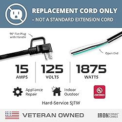 Durable AC Power Cord for Versatile Use – This heavy-duty 10 gauge 3 prong heavy duty 90 Degree Slim Plug Head replacement power supply cord cable, NEMA 5-15P is ideal for powering appliances, power tools, and other equipment. Its robust design ensures reliable performance for demanding tasks. Weather-Resistant Vinyl Insulation – This 10 gauge extension cord 10 ft Flat Plug with Grip Handle Design is made with durable vinyl and pure copper wire, the appliance cord ensures reliable and efficient power connections. Designed with SJT thermoplastic insulation, it is suitable for standard indoor use. Reinforced Blades for Long-Lasting Durability – Designed with reinforced blades, this 3 prong 10 awg power cord prevents bending or breaking, offering a dependable connection for all your heavy-duty needs. UL Certified for Safe Operation – This 10-foot, 15 amp power cable 3 prong, 90 degree slim flat plug head is UL certified and grounded for safety. It operates at 125 volts and 1875 watts, with NEMA 5-15P compatibility for a secure fit with standard outlets. Integrity in Service: Iron Forge Cable, a U.S. veteran-owned business, stands behind its replacement power cord. We're here to help resolve any issues that you may have.
