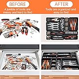 - VERSATILE TOOL BOX ORGANIZER: Elevate your tool organization with this tool drawer organizer divider set. This drawer divider trays set features 5 sizes, optimizing your workspace, garage organization. This tool organizer is an excellent wrench organizer, small parts organizer, screw organizer, screwdriver organizer, plier organizer, small tool organizer choice. 12'' LARGE DRAWER ORGANIZER: The maximum length of this tool chest organizer is 12'', which can solve the embarrassment that other toolbox organizer cannot store large tools, such as hammers and wrenches. That's what sets our tool organizers apart from other drawer organizers. This tool organizers and storage is also a great desk drawer organizer tray, drawer organizers office. 5-SIZES DESK ORGANIZERS: This desk drawer tray set with 5 tray sizes are great for desk organizers and accessories: 3'' * 3'' * 2''(34pcs), 6'' * 3'' * 2''(8pcs), 9'' * 3'' * 2''(8pcs), 9'' * 6'' * 2''(6pcs), 12'' * 6'' * 2''(4pcs). This desk drawer organization set fits most size drawer and most size tools and accessories storage. PRECISION TOOL STORAGE: Store tools in different sized tool tray, enabling you to create dedicated sections for specific tool types. The large size box is suitable for storing large tools such as hammers, pliers and wrenches. The medium size box is suitable for holding medium-sized parts such as screwdrivers, nuts and bolts. The small size box is suitable for storing small parts such as nails and screws. This organizer drawers storage enhances your efficiency and productivity. FIT YOUR TOOL CART: With interlock design, this plastic drawer organizer can seamlessly fit your tool cart, work benches for garage, rolling tool box, tool box on wheels. With mechanic tools set neatly arranged, you can effortlessly select what tools for mechanics you need, streamlining your workflow. EFFICIENT TOOL STORAGE ORGANIZER: These tool boxes are suitable for a variety of usage scenarios. It can be used in office as office drawer organizer, junk drawer organizer and garage as garage organizers and storage. It can also be used in bathroom, kitchen, workshop, and other scenes. Excellent choice as desk drawer organizers and accessories and office desk drawer organizer. DURABLE TOOL ORGANIZER BOX: Manufactured from high-quality materials, these plastic trays for organizing are durable enough to stand up to the demands of a busy workshop. Sturdy construction and interlocking design ensure these plastic drawer organizer trays can withstand constant handling, keeping your tool collection organized in your tool chests & cabinets. CUSTOMIZED TOOL BOX DRAWER ORGANIZER: Tailor your toolbox drawer organizer to your liking and tool assortment. These drawers organizer come in 5 different sizes and allow for custom arrangements, allowing you to design a hardware storage grouping and layout that fits your tool storage cabinet. These drawer containers are essential tool box widget to boost your productivity. BLACK DRAWER ORGANIZER: The stylish black design of the tools organizer makes your tools(like slip-joint plier, combination wrench, screwdriver, utility knife, groove joint plier, claw hammer, junior hacksaw, screwdriver bits, ratchet wrench, spark plug driver socket, extension bar, spring clamp, stripper, torpedo level, tape measure, hex key, scissor, long nose plier, saw, ruler, knife blade, nails, screws, bolts, tackle, gasket, clamp, and any other small parts) easily identifiable. EASY CARE BIG TOOL BOX STORAGE BIN: The tool organizers for toolboxes is also very suitable for you to use as drawer organizer desk, drawer organizer office, garage tool box. And these organizing trays are easy to clean, just rinse with water or wipe with a damp cloth to keep it clean, no need to worry about the organizer for drawers fading. If you have any problem with our organizer drawer, please contact us and we will replace a brand new organizers for drawers for you.